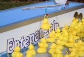 Bei diesem Jahrmarktklassiker drehen die Enten in einem Becken mit Wasser ihre Runden und können von den Teilnehmern geangelt werden. Ein tolles Spiel für die kleinen Besucher Ihres Events. Als Wettbewerbsspiel bietet sich dieses Spiel auf zwei Arten an: Entweder zählt man die in einer bestimmten Zeit gefangenen Enten oder man markiert die Enten die einen bestimmten Gewinn bringen. Sie können das Eventmodul im Selbstbetrieb mieten oder inklusiv unserem Full Service mit Transport und Betreuung. Das Becken wird mit ca. 100L Wasser befüllt. Einen Wasseranschluss sollten Sie daher in der Nähe des Aufstellortes haben.