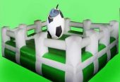 Das Fallkissen ist einem Fußballplatz nachempfunden, der Reiter sitzt auf einem großen Fußball – das Spiel Prinzip ist
