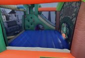 Die Hüpfburg Dino hat eine Grundfläche von 11,9 m² Die Hüpfburg ist rundum (außer vorne beim Rutscheneingang) mit einem Netz bespannt für optimale Sicherheit. Beim seitlichen Eingang ist das Netz überlappt, sodass die hüpfenden Kinder sicher sind, während andere Kinder ein- und aussteigen. Das Besondere an dieser Hüpfburg ist das Dschungeldesign und die lustige Schlange an der Riesenrutsche. Die JDino Hüpfburg ist nicht nur eine einfache Hüpfburg, sie hat außer der Hüpffläche einen Tunnel, eine Kletterwand und die riesige Rutsche.