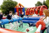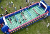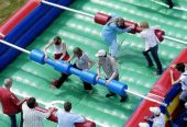 Das menschliche Tischfußballspiel ist immer “mega” angesagt. Sechs Spieler pro Mannschaft können sich als lebende Kickerfiguren auf dem aufblasbaren Menschenkicker versuchen. Wie beim Tischfußballspiel darf man allerdings seine Stange nicht verlassen – und da stehen noch bis zu zwei andere Mitspieler mit dran. Koordination und Teamgeist sind auf dem Mega Fußballkicker XXL gefragt, damit auch genügend Tore für den Sieg fallen, die von den Zuschauern mit viel Jubel und Applaus belohnt werden.
