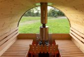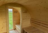 Wir bieten 4 Meterlang Holzfass-Sauna mit Innenraum 2,20m und Vorraum 1,80m für 2 (liegend) bis zu 6 Personen (sitzend)