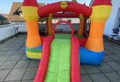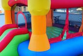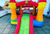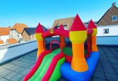 Diese Hüpfburg Schloß bunt hat eine Grundfläche von 9,67 m². Eine Party zuhause oder die Feier in der Firma: Die Hüpfburg Schloß besticht durch ihr märchenhaftes und ansprechendes Design. Sie ist mit einer extra starken Hüpffläche und großer Rutsche ausgestattet. Diese Hopseburg ist der “Star” auf jedem Fest. Besonders sicher ist diese Hüpfburg durch die seitlichen Fangnetze. Beim seitlichen Eingang ist das Netz überlappt, sodass die hüpfenden Kinder sicher sind, während andere Kinder ein- und aussteigen. Im Lieferumfang ist nicht nur die Hüpfburg enthalten, sondern auch das Gebläse, die Bodenanker und eine Tasche.