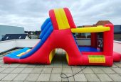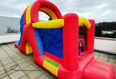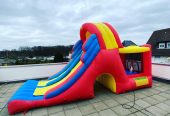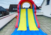 Die Hüpfburg Mega Slide hat eine Grundfläche von 12,9 m². Die Hüpfburg ist rundum (außer vorne beim Rutscheneingang) mit einem Netz bespannt für optimale Sicherheit. Beim seitlichen Eingang ist das Netz überlappt, sodass die hüpfenden Kinder sicher sind, während andere Kinder ein- und aussteigen. Das Besondere an diese Hüpfburg sind die beiden Riesenrutschen. Um auf die Rutsche zu gelangen, kann man erst ein bisschen im Hüpfbereich sich austoben, dann die Kletterwand bezwingen und die Rutsche nach unten sausen. Im Lieferumfang ist nicht nur die Hüpfburg enthalten, sondern auch das Gebläse, die Bodenanker und eine Tasche.
