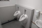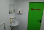 Das Herrenabteil ist ausgestattet mit einer Toilettenkabine und zwei Pissoirs, einem Waschbecken, Seifenspender, Papierhandtuchspender, Spiegel und einer Heizung.
